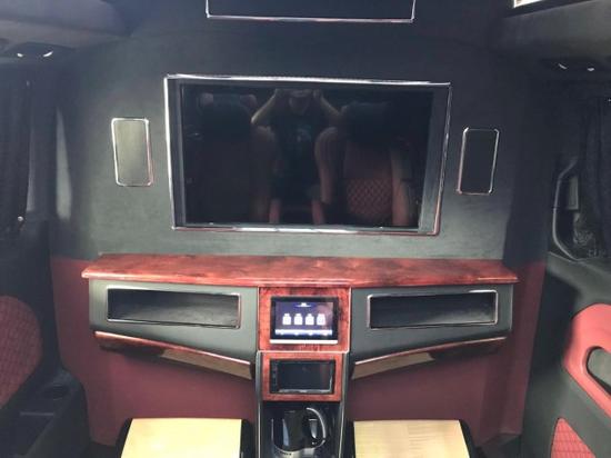 乘客舱中的秘书座椅可以全自动调节,“首长席”电动控制,带多项按摩功能,柚木装饰下,现代感更为强烈,条纹表面更具侵略性。乘客舱中配备一键式超静音32寸高清液晶升降电视隐藏式办公桌板、指纹识别便捷保险柜、无线网络终端接口、BSB、VGA多功能连接口。无论商务、旅行、文艺、清新、简约等什么风格都能Hold得住。