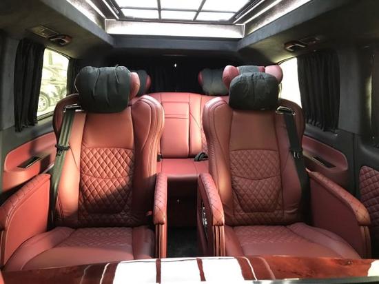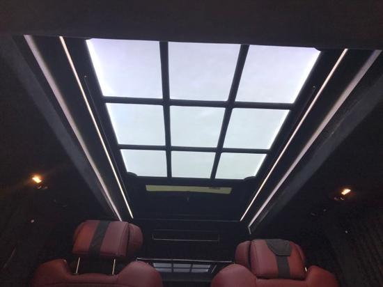 进入后舱,立刻就会被它的豪华绚丽而征服,驾驶舱与后舱是分隔设计的,形成两个独立的空间。中间由一台超大液晶升降电视(32寸)及柚木多功能吧台及柏林之声音响组成,整车环保真皮包裹,金网花地板铺设,豪华感无处不在。全部采用真皮制作,豪华木饰装点,装有按摩加热通风功能。后舱前为两个独立航空座椅,后为一组沙发座椅(可电动展平,形成一张舒适的沙发床)。