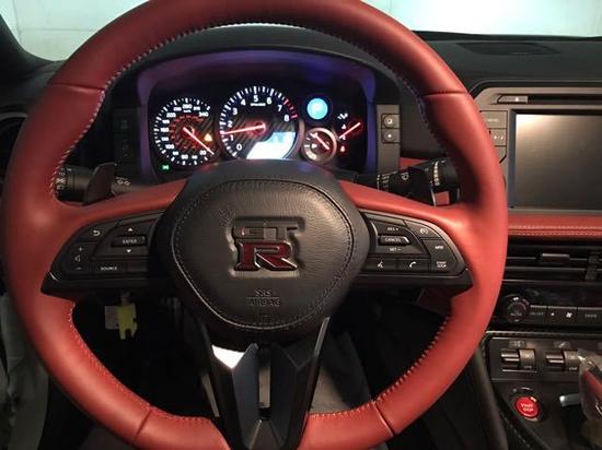 2017款日产GTR的内饰运动色彩要比普通版更浓郁一些,全黑内饰被一些红色的装饰点缀的恰到好处。方向盘采用反毛皮,出汗打滑的情况基本就杜绝了,抓握感非常不错。仪表盘的转速表更换为红底衬托,机械感非常强烈,真心好看!
