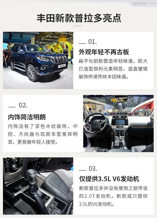 其实前段时间普拉多的2.7L版本已经停产,因为它无论是动力还是越野性能都太弱。新款车型保留了7GR型3.5L发动机,其最大输出280马力,匹配6速手自一体变速箱,只不过这个发动机建议使用95号油品,不再向以前那样极端吃苦耐劳。而它的四驱系统也变成分时四驱,不过其越野能力并不会下降