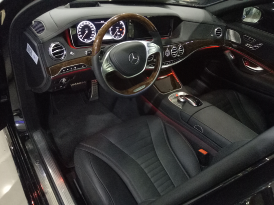2017进口奔驰S400L 车内实木与真皮相间包裹所带来的视觉效果和手感都饱满坚挺,方向盘和中控台等处用桃木色加以装饰,透露出浓重的商业气氛,中控台采用大量高品质实木面板精巧的中央送风口和指针式时钟完美镶嵌其中内饰中最大面积的电子装备就是12.3英寸的两块高分辨率屏幕了。S400L (中东版)选材到制作工艺都考究至极,对于细节的把控更是精益求精。这其中最“显眼”的细节之一当数诗米安皮革内饰了,采用立体菱形缝线工艺的真皮包裹内饰无论是从视觉还是触感上,都达到了一种极致的体验。此外,环境氛围照明系统、专属沉香香氛系统等,都使本就奢华的内饰更为动人。