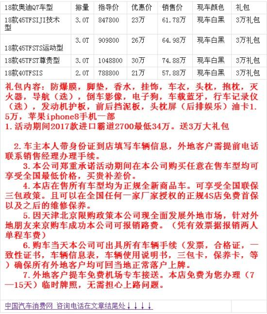 2018款中规进口奥迪Q7 (配置|询价)大量现车到店,临近年末现车冲量最新报价优惠,多款配置颜色可选。本公司的服务宗旨为诚信为本、顾客至上、一次合作、终身为友!17年最新进口车行情,了解更多进口车资讯请致电,一手贸易商拒绝中间加价真实车源手续完善,质量保证,购车可日办理上牌业务异地可上牌,感兴趣的朋友不妨到店详询!全国最低价格尽在本公司,店内车辆关单、商检齐全 ,当日提车,全国购车皆可办理分期付款。更多优惠促销请致电咨询,为您提供更多最新最快的行情,购车即送豪华大礼包(油卡加装饰)。(购车热线及详情请见文章底部)↓