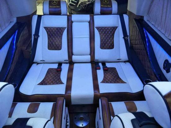 第二排座椅采用进口航空座椅,自带按摩加热通风,前后电动调节,头枕电动可升降,靠背电动调节,座椅采用一键式记忆恢复功能,第二排与第三排之间有可拆卸便携式商务桌板,可进行商务洽谈,喝茶聊天打牌。奔驰V260L商务改装车豪华性不只在于加装高顶和座椅,更在于前后仓隔断的设计和配置,此隔断采用包裹式吧台式设计,由32寸超薄可升降三星或索尼电视,菲利普蓝光DVD,Bose5.1立体环绕音响,后仓独立空调控制开关,航海钟石英表。