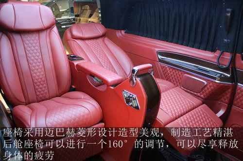后舱座椅可以进行一个160°的调节,不管您是进行商业洽谈还是长途旅行,160°的调节让你尽情的释放浑身的疲倦,另外采用迈巴赫菱形设计的座椅,不仅造型美观而且制作工艺十分精湛。