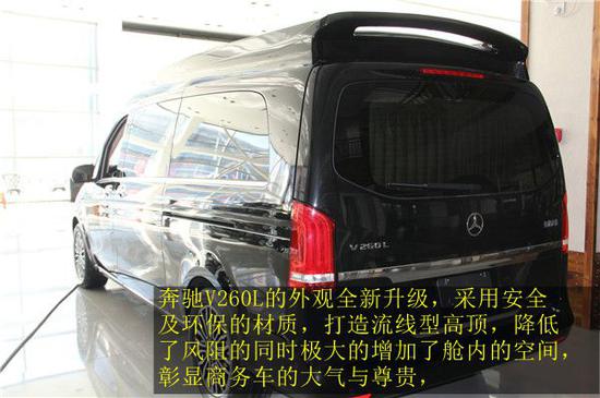 奔驰V级 (配置|询价)V260L改装车·从外观上看的话,流线型车身造型,运动时尚又不乏稳重大气的质感,整车的完整结构性特色突出。奔驰V260L采用家族式的设计,镀铬进气格栅向两侧延伸,梅赛德斯奔驰的标志镶嵌在中间,无时无刻不再显示着驾驶者的尊贵身份。