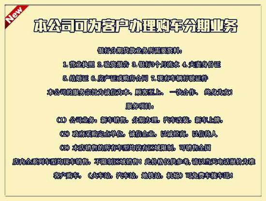 免责声明:以上购车优惠信息由新浪网综合经销商提供,由于行情因素价格浮动较大,仅供购车参考;其真实性、准确性及合法性由经销商负责,本网不提供任何保证,亦不承担任何法律责任。