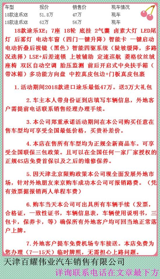 近日18款日产尼桑途乐Y62大量现车到店。目前店内车辆关单、商检齐全,手续正规,当日提车,全国购车皆可办理分期付款。平行进口逆袭惠降,到店购车享星级会员服务,想了解更多优惠促销详情请致电文结尾处商家电话,为您提供最新最快的行情报价。