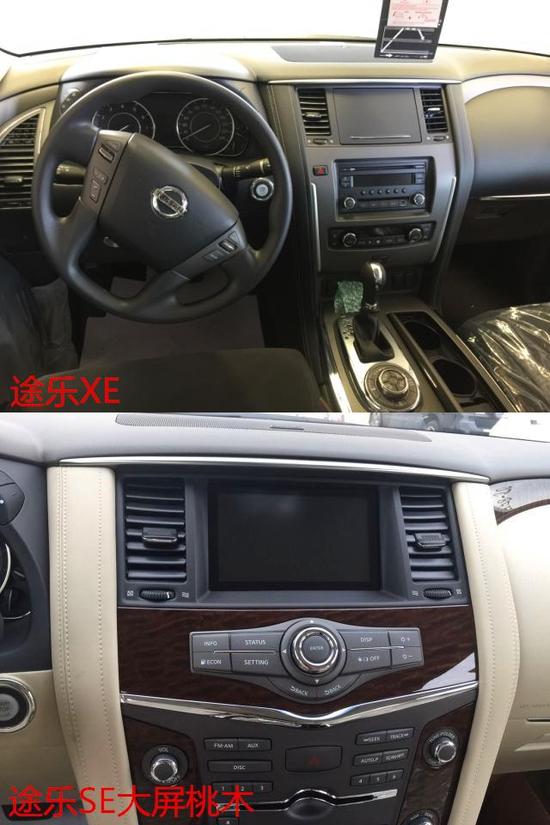 而内饰方面,差异就比较大了,通常途乐4.0XE版内饰为黑色,而SE版内饰为米色,而且带有原车米色真皮,还比XE版多中控显示屏,以及桃木内饰等