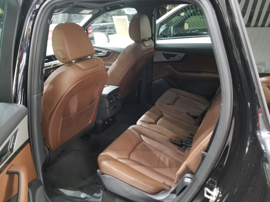 2017款奥迪Q7加版2.0T进取型座椅皮质细腻,软硬适中,偏向舒适化的定位。在乘坐空间方面宽大的座椅和充裕的横向及纵向空间使其整体表现非常不错。虽然相比老款车型车身尺寸进行了缩减,但是乘坐表现上却并没有缩水。第二排座椅同样非常宽敞,头部及腿部空间都表现不错。而第三排座椅空间,在不移动第二排座椅的情况下则略显局促。当放倒第三排座椅后,行李厢能够扩展出超大的载物空间。