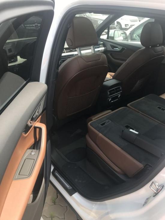 2017款奥迪Q7加版2.0T进取型座椅皮质细腻,软硬适中,偏向舒适化的定位。在乘坐空间方面宽大的座椅和充裕的横向及纵向空间使其整体表现非常不错。虽然相比老款车型车身尺寸进行了缩减,但是乘坐表现上却并没有缩水。第二排座椅同样非常宽敞,头部及腿部空间都表现不错。而第三排座椅空间,在不移动第二排座椅的情况下则略显局促。当放倒第三排座椅后,行李厢能够扩展出超大的载物空间。
