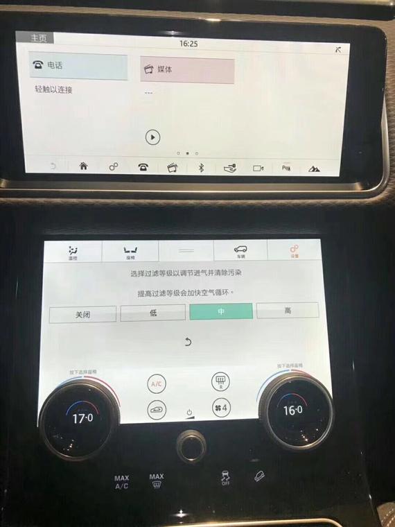 2017款路虎揽胜星脉柴油版车内搭载一套InControl Touch Pro Duo系统,这套系统的最大亮点在于“双10英寸触摸屏”,集成了智能手机互联、平板电脑互联、导航、多媒体等功能。上方屏幕最主要的功能在于导航,可显示道路整体路况、规划线路、目的地到达时间等信息;驾驶员可通过下方的触摸屏对车内大部分功能进行调节,因此车内实体按键极少,整个中控十分简洁。
