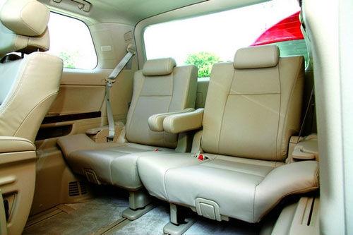 在保证中排乘客拥有舒适坐姿的同时,第3排座椅的乘坐舒适度甚至已经堪比某些A级轿车。在必要的时候,还可将第3排座椅折叠并收起固定,同时将第2排座椅向前滑动,一个超大的行李空间跃然眼前。通过对第2、3排座椅的调节和收纳,埃尔法的车内可以提供多达6种空间形态,满足各种乘坐和载物需求。除了空间上所体现的奢华,埃尔法还体贴地为后排乘客提供了单独的天窗,并且在车顶的边缘安装了LED氛围灯,顶置的9英寸LCD影音娱乐系统也可以通过遍布车内的喇叭发挥不错的视听效果。