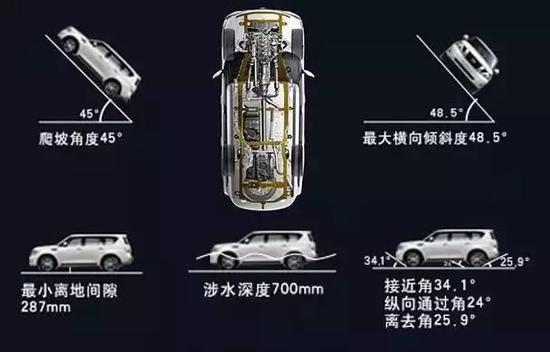 虽然车身尺寸庞大,但似乎对它的通过性能并没有太大的影响。从上图可以看出,不管是离地间隙、涉水深度、爬坡角度,或者是接近角、通过角、离去角,途乐的数据都相当可观。