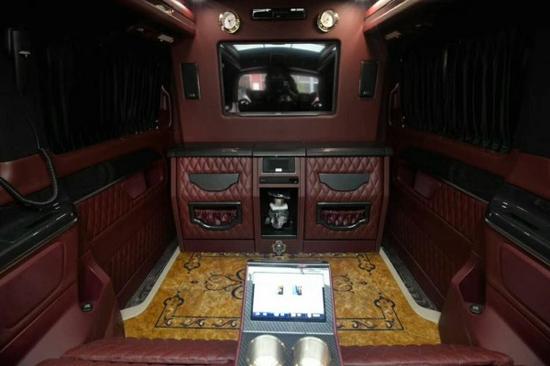 高档电动调节对开天鹅绒窗帘,全车内饰选用进口珍稀实木装点(可选酸枝山木、檀木龙云纹、龙血檀木),进口珍稀木质双色拼接航空级木地板(可选酸枝山木、檀木龙云纹、龙血檀木),迷你科技空气净化器(可持续运行600小时无故障),GPS全球卫星导航系统带倒车影像双电池供电系统