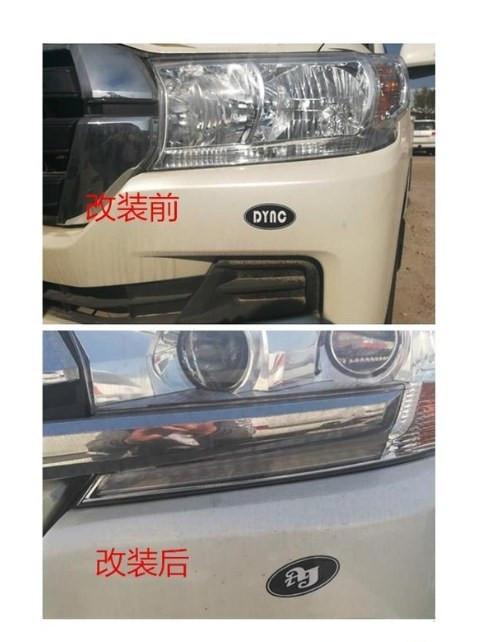 改装前后接下来,在大灯方面,丐版酷路泽4000是中东版的原装卤素大灯,照射程度也不错,但是有很多朋友都比较氙灯,尤其是LED日间行车灯。这些在改装车间里,真的就是小菜一碟了,还有雾灯是必须要改的。