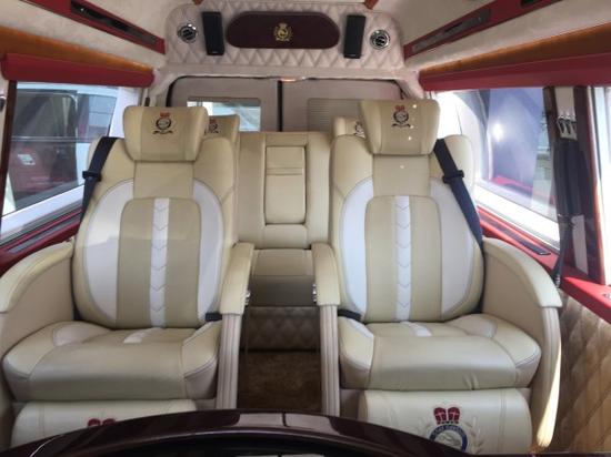 在内饰方面以红色外主调,全车真皮包覆,采用了大量的进口奢侈用料。高清电视、高级音响音质效果完美。爱马仕版的福特E350,简直是奢华到无法无天了。高端时尚的元素与福特房车的结合,特有的花纹端庄高雅,又且时尚的前端。