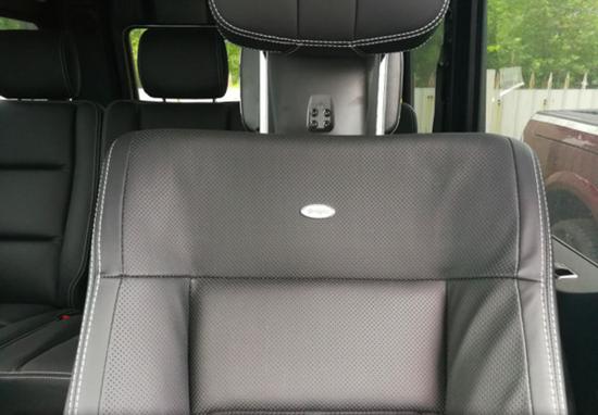 17款奔驰G500的仪表盘带有半嵌入式显示器,三辐式真皮方向盘上布置了12个控制按钮,8英寸中控屏和支持多点触控的手写触摸板构建起奔驰最新信息、娱乐、互联系统的控制中心。奔驰G500至于后座两张独立座椅部份,除了同步施以红色真皮材质包覆外,更采用了特殊的红色格纹缝线,打造出订制改装车款独特的奢华风格。