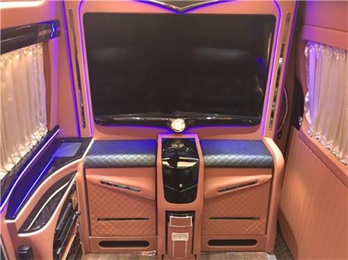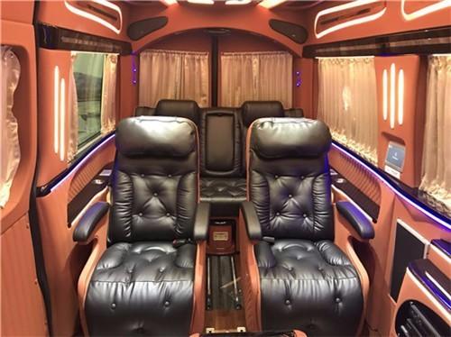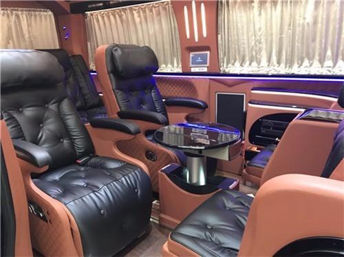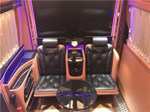 奔驰斯宾特尊贵限量版的内饰座椅配色十分美观大气,两个全自动隐藏座椅,一个全自动吧台可以供乘客下棋娱乐,另外吧台的桌面也是真皮铺设的,非常美观结实耐用。车内大面积真皮包裹,前后排座椅均可向后大角度放倒,方面躺着休息,前后排均有触控屏幕,电动窗帘、全自动隐藏吧台、可升降高清曲面大屏液晶显示器、boss音响等等通过控制屏均可操作,可办公,可娱乐。