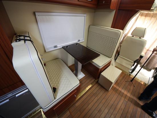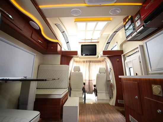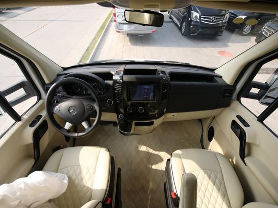2,内饰体验感受 奔驰24H豪华房车后舱双拓展,使得休息空间更大,全舱原木地板,豪华木饰家具,带淋浴的卫生间,舒适的大床可以扫水做饭的厨具,俨然是一个移动的家。 驾驶舱空间充足,视野开阔,各项仪器设备齐全,正副驾驶真皮包裹,软硬适中,乘坐舒适与后舱相投沟通方便。