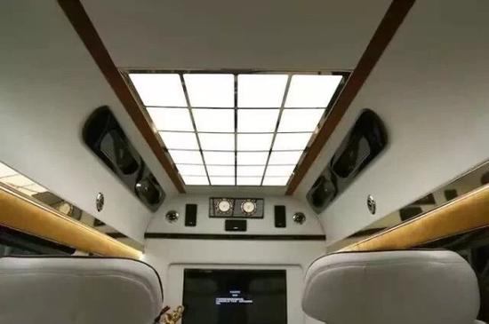 在隔断处,福特E350安装了40寸大屏液晶电视,福特为了更加多元化的实际需求考虑,为其配备了灵活的电动升降功能,降下隔屏则更偏向于全家出游的模式。搭配BOSE5.1声道套装音响,在车厢内就能体验家庭影院。