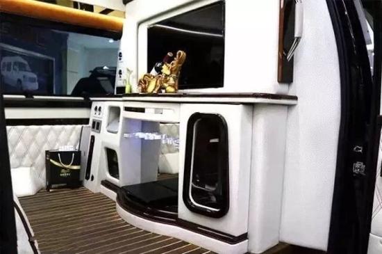 在大尺寸液晶电视的下方,福特E350安置了一个小型吧台,整体吧台设计则延续了福特E350房车一贯的游艇吧台式格局,中央为SONY蓝光DVD播放器,下方则是酒柜、储物格,反光玻璃的加入则更显立体感。