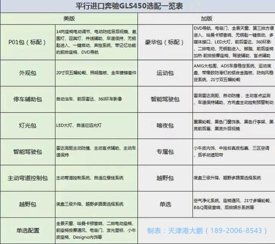 内饰方面的做工和细节设计方面,两个版本的车型几乎没有太大的差别,差异主要体现在舒适与高科技配置方面。加版奔驰GLS450配置起步就比美规版要高。加版标配豪华包,美规标配是:19寸轮毂、小窗、真皮座椅带加热、八项电动座椅调节等。具体请看下表-具体罗列了两个版本的选配包及所含配置。