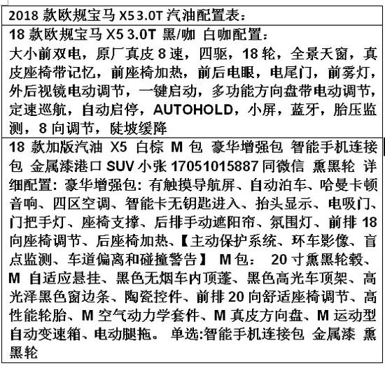 今天介绍的2018款欧规宝马X5 3.0T虽然配置不太高,但是在港口属于性价比超高和销量的主力军,下面来看一下这款车的详细配置:大小前双电,原厂真皮配置:8速,四驱,18轮,全景天窗,真皮座椅带记忆,前座椅加热,前后电眼,电尾门,前雾灯,外后视镜电动调节,一键启动,多功能方向盘带电动调节,定速巡航,自动启停,AUTOHOLD,小屏,蓝牙,胎压监测,8向调节,陡坡缓降。