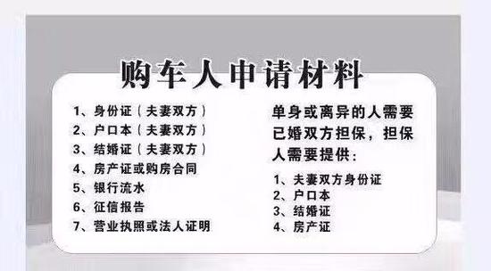 1。身份证(夫妻双方)2。结婚证(任意一方)3。半年个人流水(夫妻双方)4。房产证或不动产发票5。营业执照,企业章程或收入证明6。驾驶证7。夫妻双方户口本(首页和本人页) 8。银行卡正反面照片 6--200万以内汽车可做分期贷款业务,手续齐,材料齐,审批快,提车快