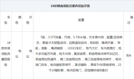 平行进口车了解到2018款林肯领航员第一批接受定金预定,搭载3.5T双涡轮增压引擎,变速箱10速,提供450马力335千瓦的动力,店内车辆可享受全国质保,保修,包换,包退,我们有多年为客户服务的成功经验,为您提供最合适您的最佳方案。我们为您提供的每一辆车都是经过严格的PDI检查,售后有让您放心的质量担保。全方位的优质服务,高素质的员工队伍都为您所备。国外一手发货资源、国内最优惠的销售价格、长期稳定发车货源、竭诚欢迎有实力经销商、客户前来洽谈!
