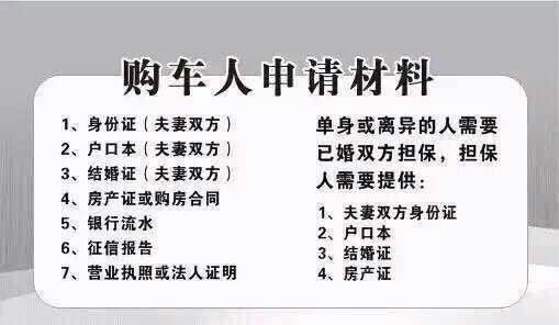 本公司可办理全国分期付款:1:身份证(夫妻双方)2:户口(户口本双方主页)3:结婚证(夫妻双方)或单身证明原件4:驾驶证5:房产证或购房合同6:近六个月银行流水7:公司资质