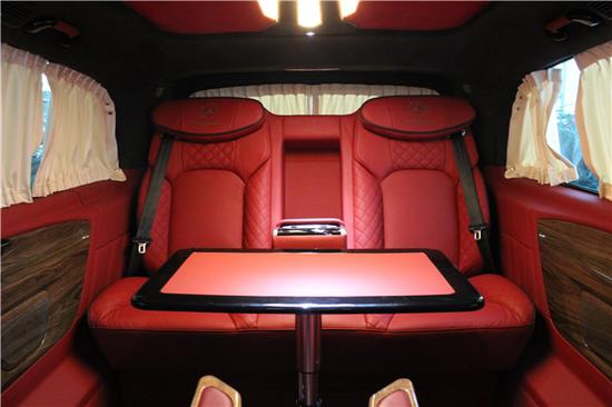 后舱第三排座椅采用三连座沙发设计一键成床的设计快速成为一张舒适的大床,可拆卸的桌板使得后舱可以快速改变成一个私密的会议空间使得私密会议更加完美,即便是在路上也能应对各种商战中的突发状况。