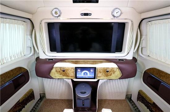奔驰V260车身打造的类似奔驰豪华房车的前后舱全隔断式设计格局,使二者有相对独立的空间和氛围感,同时又具备了更佳完备的隔音防噪表现,集成了32寸LED液晶电视,环绕式立体声音响以及进口时钟套件,下设多功能一体式吧台,钢琴烤漆材质的桌台,预留了行车途中实用的杯托设计,其下为后舱电器触控屏。咨询热线:15811007765