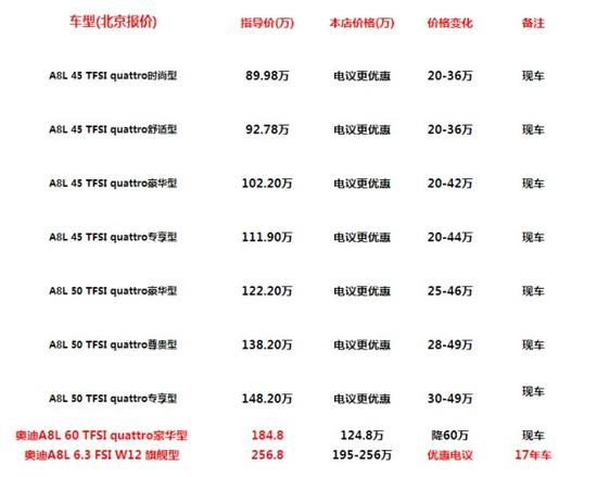 [天津滨海行情·原创]近日获悉,大功率2017款奥迪A8 (配置|询价)现车到店,专卖店现车销售进口奥迪A8底价出炉,大功率越野无可比拟,超值爆惠限时秒杀,2017款奥迪A8L整个车头造型更加干练,新设计的保险械使得下进气格栅贯穿了整个车头,让奥迪A8L从正面看去更宽扁。由多个横向灯带组成的尾灯让尾部显得更宽且全部采用LED光源,贯穿后备箱的镀铬饰条与尾灯相结合,这种设计无疑更讨好国内用户。购车咨询热线在文章下方,详情来电咨询!(电话同微信)