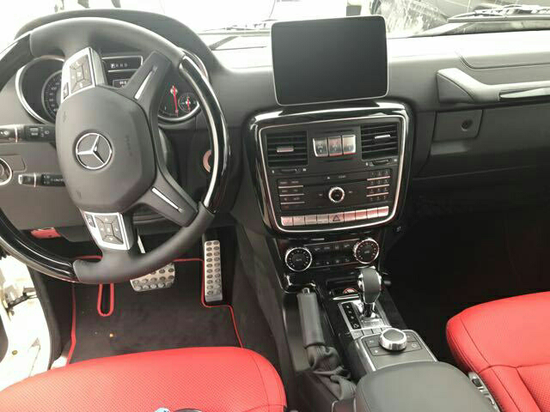 17款奔驰G500的仪表盘带有半嵌入式显示器,三辐式真皮方向盘上布置了12个控制按钮,8英寸中控屏和支持多点触控的手写触摸板构建起奔驰最新信息、娱乐、互联系统的控制中心。奔驰G500至于后座两张独立座椅部份,除了同步施以红色真皮材质包覆外,更采用了特殊的红色格纹缝线,打造出订制改装车款独特的奢华风格。
