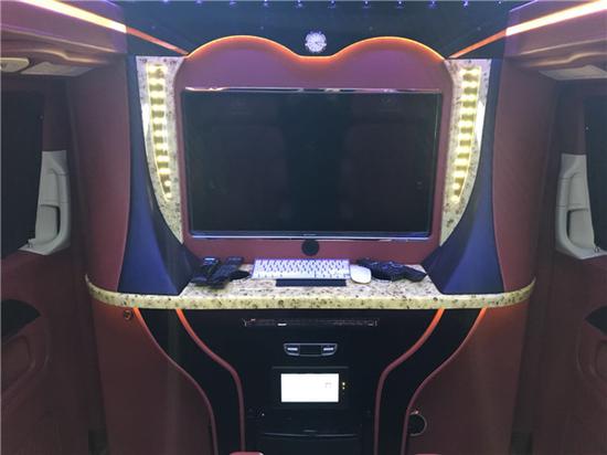 在奔驰威霆原型车的设计中,并没有这道全铝材质的中央隔屏,但却是当下改装车的一种常态,有个更佳的密闭隔音性,同时有了基础去承载多样化的娱乐、生活配置。带电动升降的42寸液晶电视,配备卫星电视信号接收功能,往下是深色桃木架构的一体式吧台,在倾向座椅的一侧,集成了整个后舱电器控制触摸屏,此外,还有胶囊咖啡机、蓝光玻璃酒柜这类的生活化体现。