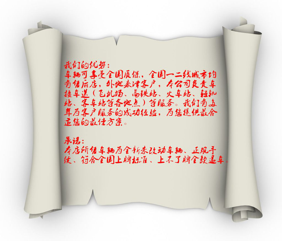 我们的优势:车辆可享受全国质保,全国一二线城市均有售后店,外地来津客户,本公司负责车接车送(飞机场、高铁站、火车站、轻轨站、客车站等各地点)等服务。我们有多年为客户服务的成功经验,为您提供最合适您的最佳方案。