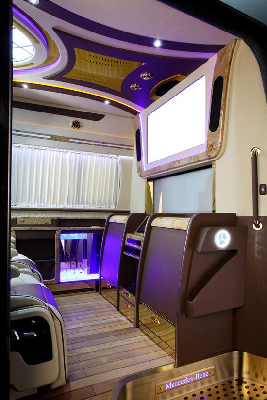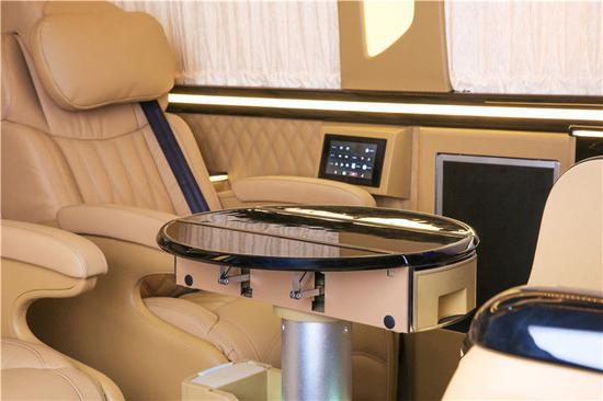 那出乎意料的是此款奔驰房车采用了复古风揉合现代科技感的混搭风格,既能彰显奔驰系列尖端造车工艺的厚重品牌底蕴,凸显主人不凡品味的同时,又能很好的融合现代科技所带来的舒适化个性配置,做到真正意义上的宜商宜家。从这个角度看,奔驰斯宾特房车的前后舱隔屏是正经的液晶电视加标准吧台设计,且满溢着古典纹饰板所营造的古色古香,下置无非是个多功能储物盒罢了;好,今天我们在斯宾特房车上也见证一回奇迹,一键拓展隐藏式对坐总裁秘书座椅,常规7座,必要时拓展九座。