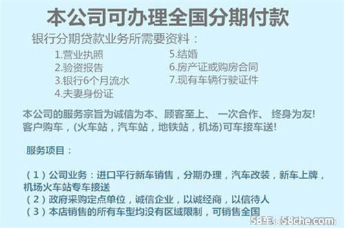 公司介绍:本公司一直以诚信为主 顾客至上的理念经多年本公司办理全国分期付款业务为方便您购车,我公司现已成立银行分期部门,与各大银行建立合作关系,让贷款变的不再艰难,让您合理的利用自己的资金,让您更快的驾驶上您心仪的座驾!银行分期贷款业务所需要资料:1。营业执照