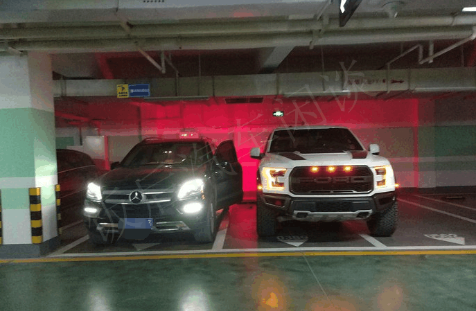 图为杨先生的2017款福特猛禽F150和他朋友的奔驰停在一起,虽说这辆奔驰也很俊朗,但是和1.992米高的猛禽F150停在一起也显得小了些。