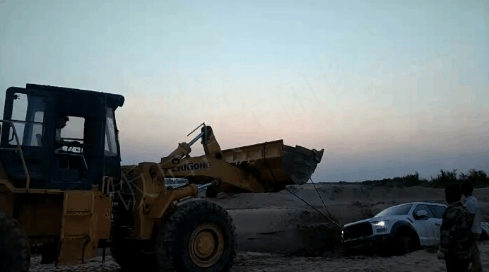随后车主叫来了拖车,由于这辆大家伙比较沉重,而且陷的很深,因此最后只能找来了一辆马力较大的铲斗车。
