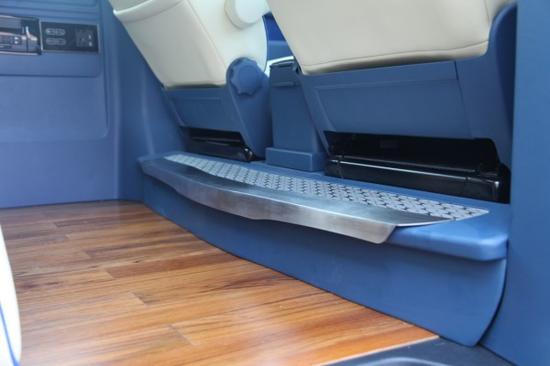 大众T6凯路威改装版本在左侧A柱处安装有前后舱通话系统,方便后舱的贵宾随时与司机进行沟通。同时,大众T6的前门外侧都设计有二级踏板,因为高腰线和大轮胎导致车身底盘较高,这样就便利于车内乘客的进出,特别是对于女性乘客来说,这是一个人性化的设计。
