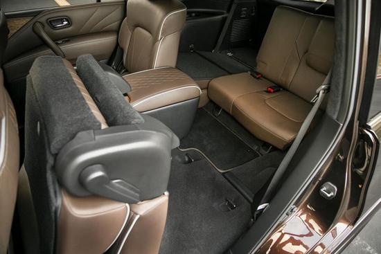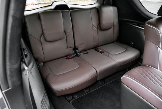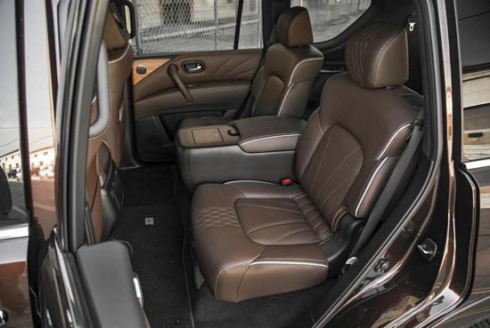细节方面:平行进口新款英菲尼迪QX80 前两排座椅为乘客提供了顶级的舒适性,抛开轴距长度来说,它的第二排乘客腿部空间是同级别中最为优秀的。与第二排相比,第三排的座椅空间并没有那么出色,但是仍比凯雷德要更为宽敞,乘坐舒适性也要更胜一筹。行李舱空间为470升,介于凯雷德和林肯领航员 (配置|询价)之间。