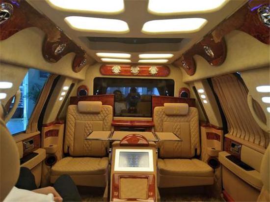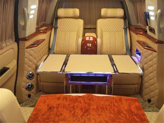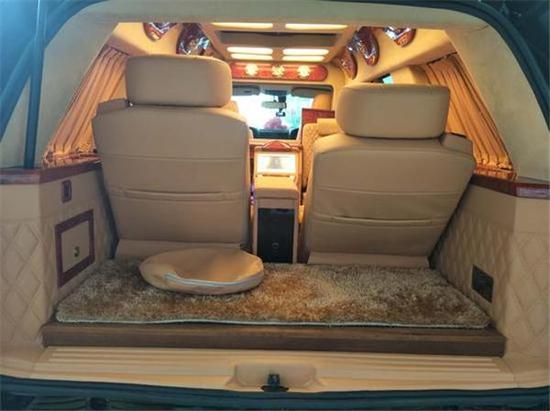 林肯领袖一号说到最豪华部分就是它的内饰装修了,电动桌板,隐藏座椅,伸缩咖啡机,这些配置都是进口产品。林肯领袖一号配了32寸液晶电视,蓝光DVD,BOSE音响以及前后对讲机,豪华程度可以说是比劳斯来斯还要齐全。
