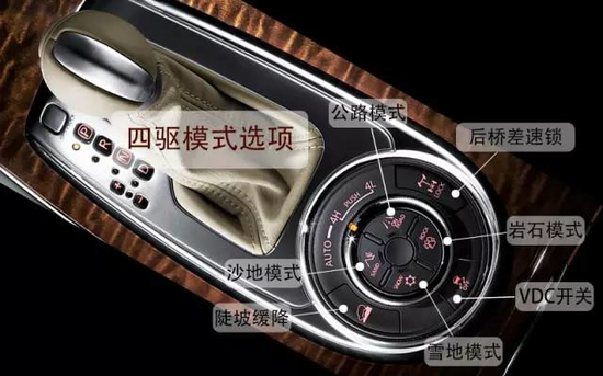 四驱系统 如图所示:这款中东版途乐配备了一套全时四驱系统,分为公路/岩石/雪地/沙地模式。除此之外,它还带有后差速锁,再配合强大的四轮电子辅助,让途乐拥有了非常强悍的越野能力。