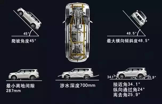 虽然车身尺寸庞大,但似乎对它的通过性能并没有太大的影响。从上图可以看出,不管是离地间隙、涉水深度、爬坡角度,或者是接近角、通过角、离去角,途乐的数据都相当可观。24小时购车咨询热线:17602271186(同微信)