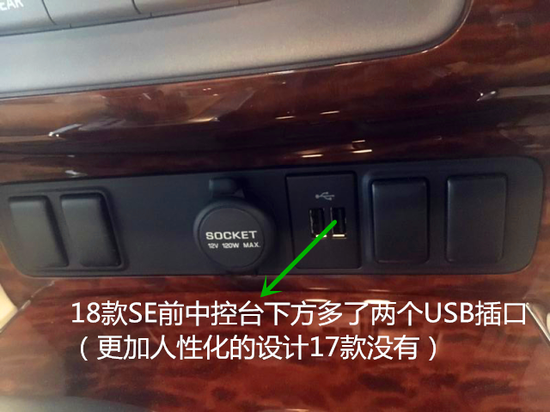 中控台下方,多了两个USB插口,虽然不是什么高科技,但是很人性化,而且17款上面是没有的。并且,后排空调控制面板下方,也多了两个USB插口,所以,18款SE前后一共4个USB插口,算是与时俱进了。