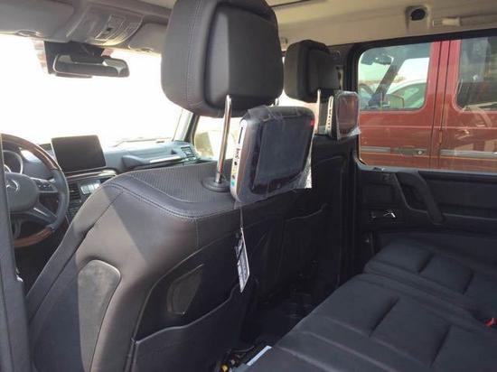 2018款奔驰G500美规版此车实拍图配置详解:7速/真皮 桃木方向盘 前中后差速锁 前排座椅加热带通风 电动天窗 注意力协助 前后电眼 倒影 自动空调 导航 哈曼卡顿音响 氙灯 盲点辅助 并道辅助 后娱 19轮 。