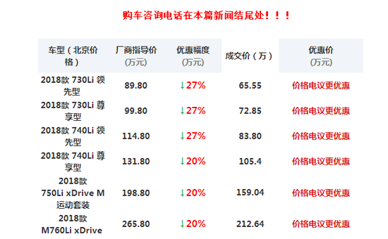 近日,天津进口宝马经销商处店内获悉,目前店内2018款宝马7系 (配置|询价)现车在售,颜色齐全配置可选,在活动期间在店购车就可以享受最高40万元现金优惠,并赠送38000元豪华大礼包,可在全国各地落户上牌,让广大客户没有任何的后顾之忧没有区域限制,保证客户回所在区域正常上牌。当天可办理临时牌照(周末不休息),活动期间为答谢新老客户多年来的支持和厚爱,特推出外地客户来京购车可报销:[单程车票或机票,限3000以内]活动时间有限,欲购从速,这真是消费者购买车的好时机!公司承诺:我们不做市场最低价,低了没保障,不做最高价,高了没感情,只挣我们该挣的钱,只交该交的情,认真做事,合作共赢,和我们合作不敢保证你花最少的钱,我敢保证让你省最大的心,得到质量,效率、利益、共赢局面,期待每一位新老客户的合作!用心服务、传递信任!我愿与您长期合作!我们力求完美服务的坚持做好,专业与持续做专,速度与效率做大,创新与变化做强,也秉承“经营追求诚信,价格追求合理,合作追求双赢,服务追求满意”的宗旨。公司贯彻执行精确管理,销售团队经过专业培训!购车咨询热线在文章下方,详情来电咨询!