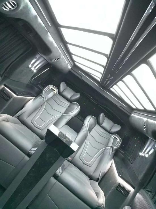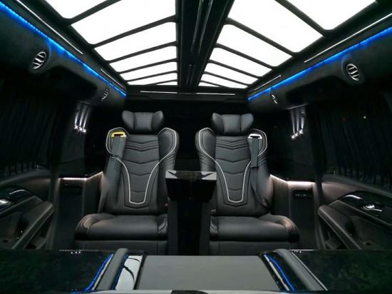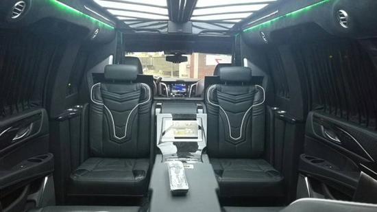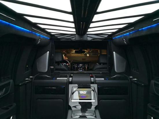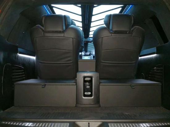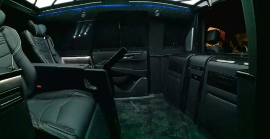 2018款凯迪拉克总统一号内饰部分:2个隐藏座椅是由吧台改装而来,40寸超大屏液晶电视带有升降系统,总统一号内饰还配置有美式咖啡机,进口茶杯,高端雨伞,对讲机,BOSE音响以及进口柚木地板。