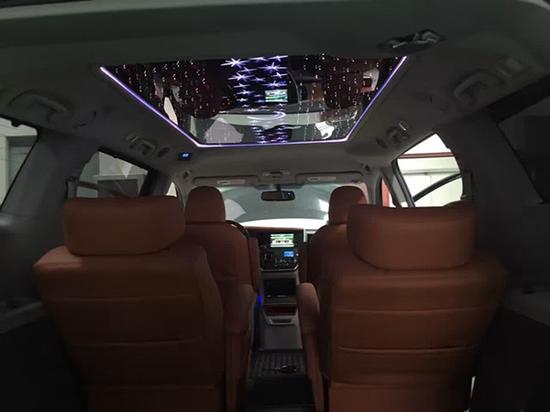金属漆、小天窗、单选智能卡(无钥匙进入、一键式启动)、行李架、19寸轮毂)、备胎,倒影、私密玻璃、行李架、电眼、双侧电动门、电动尾门、后视镜加热、儿童锁、前座椅加热、电动座椅、七座真皮座椅(三排折叠隐藏)、 4碟CD转换、USB接口、多功能方向盘、中央储物箱、二排手动遮阳帘,运动包围,熏黑处理大灯及尾灯